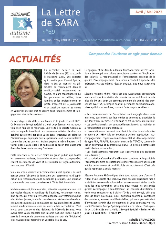 Vous souhaitez suivre les actions de Sésame Autisme Rhône-Alpes ? Tous les 2 mois, retrouvez la Lettre de SARA pour rester informé sur l’actualité des résidents et professionnels de l’association.